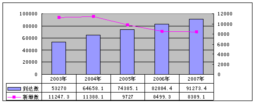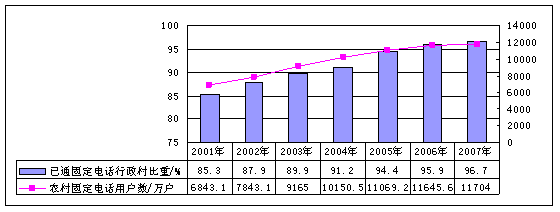村村通电话工程向纵深发展。2007年,农村固定电话用户数11704万户,3759个行政村新开通电话,新疆、内蒙古、黑龙江、海南等地的生产建设兵团、林场农场、油田等2536个基层生产单位新开通电话,全国已通电话行政村比重从上年的98.9%上升到99.5%,已有29个省、自治区、直辖市实现所有行政村通电话。2007年5月自然村村通工程正式启动,到2007年底,20036个20户以上无电话自然村新开通电话,上海、天津、江苏、广东、宁夏等5省、自治区、直辖市实现了20户以上自然村全部通电话。(参见图1.1)