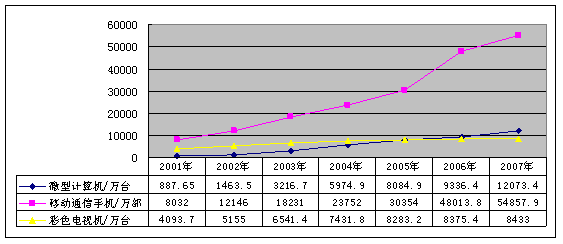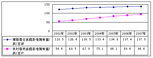 图1.16   2001-2007年城镇与农村居民家庭彩电拥有量变化情况