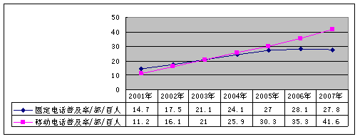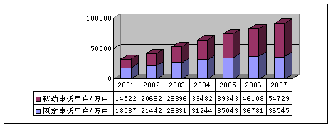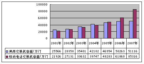 图1.13  2001-2007年局用交换机和移动电话交换机容量