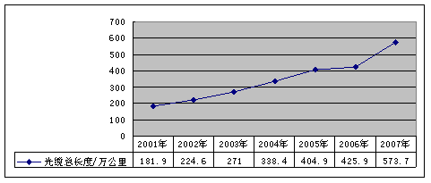 2007年,全国光缆线路总长度573.7万公里(参见图1.12),其中长途光缆线路长度77.4万公里。固定长途电话交换机容量1747万路端;局用交换机容量51116.3万门。移动电话交换机容量85316.3万户(参见图1.13)。基础电信企业互联网宽带接入端口新增2052.8万个,达到8539.2万个。全国互联网国际出口带宽368927M,同比增长43.7%。
