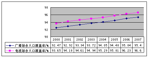 广播电视综合覆盖能力继续提高,新媒体建设不断推进。2007年,全国广播电视台达到1993个,比上年增长3%。有线电视入户率为39.9%,有线电视用户达到1.53亿(参见图1.14),其中有线数字电视用户2686万,较2006年翻了一番,全国已有30个城市完成数字化整体转换。广播、电视人口综合覆盖率分别为95.4%、96.6%(参见图1.15)。城乡居民彩电拥有率进一步提高(参见图1.16)。2007年,全国电台电视台大都开办了互联网站,有27家省级广播电台、广播电视总台开办了网络广播业务,167套广播频率实现网上直播,25家广播电台、电视台开办的网站提供网络电视直播业务。手机电视、车载电视、IP电视等得到了重视和发展,北京、上海、南京、杭州、合肥等城市先后开展了车载电视业务。