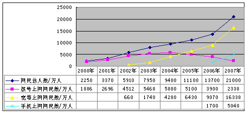 截至2007年底,全国网民数新增7300万人,达到2.1亿人,同比增长53.3%。宽带网民数达到1.63亿人,占到总体网民的77.6%,同比增长79.7%;手机网民数为5040万人,占到总体网民近四分之一,同比增长196.5%(参见表1.4,图1.17)。互联网普及率达到16%。