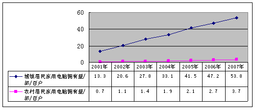 2001-2007年城镇与农村居民家庭电脑拥有量变化情况