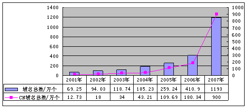 2007年底,中国域名总数为1193万个,同比增长190.4%。增长的主要拉动因素来自CN域名,CN域名数量已达到900万个,比2006年同期增长接近了4倍。(参见图1.19)