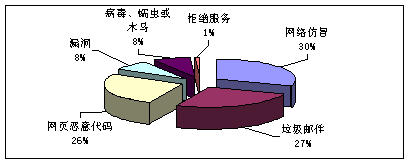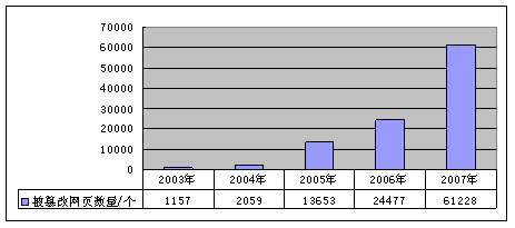 各种网络安全事件显著增加。2007年,国家计算机网络应急技术处理协调中心(CNCERT/CC)接到非扫描类网络安全事件报告4390件,与2006年相比成倍增加,所报告的网络安全事件主要有网络仿冒、垃圾邮件和网页恶意代码事件等(参见图1.23)。网络仿冒事件数量由563件增加至1326件,增长近1.4倍;垃圾邮件事件数量由578件增加至1197件,增长达1倍;网页恶意代码事件数量由320件增加至1151件,增长近2.6倍;被篡改网站数量累积达到61228个(参见图1.24),比上年增加了1.5倍;被植入木马的主机IP数量是上年的22倍(参见图1.25),木马已成为互联网的最大危害。